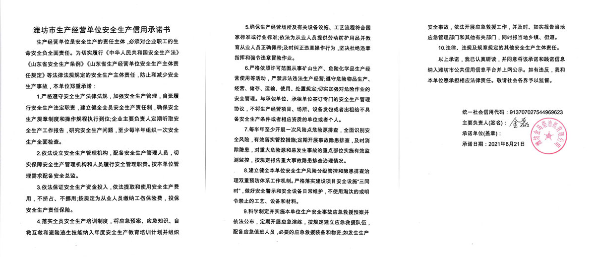 潍坊市生产经营单位安全生产信用承诺书